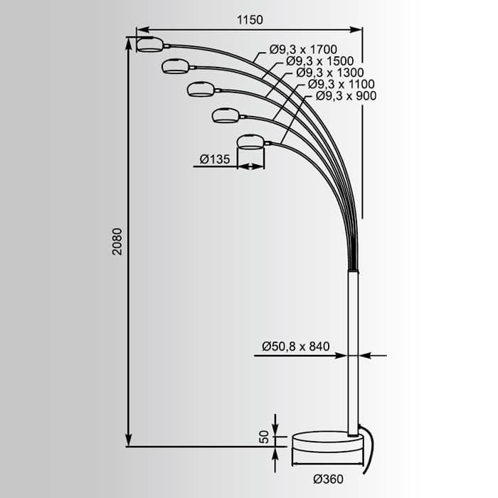 Для торшера необходима 5 ламп накаливания 40 W и цоколем E14. Лампы приобретаются отдельно. Габариты изделия: высота – 2080 мм, диаметр – 135 мм.