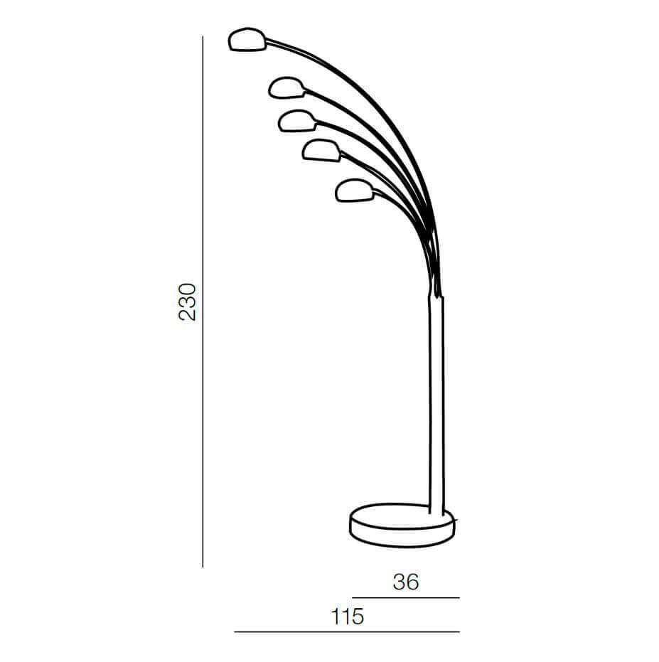 Для торшера необходима 5 ламп накаливания 40 W и цоколем E14. Лампы приобретаются отдельно. Габариты изделия: высота – 2300 мм, диаметр – 360 мм.