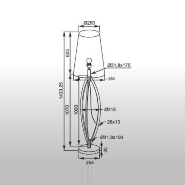 Для торшера необходима 1 лампа накаливания 60 W и цоколем E27. Лампы приобретаются отдельно. Габариты изделия: высота – 1433 мм, диаметр – 250 мм.