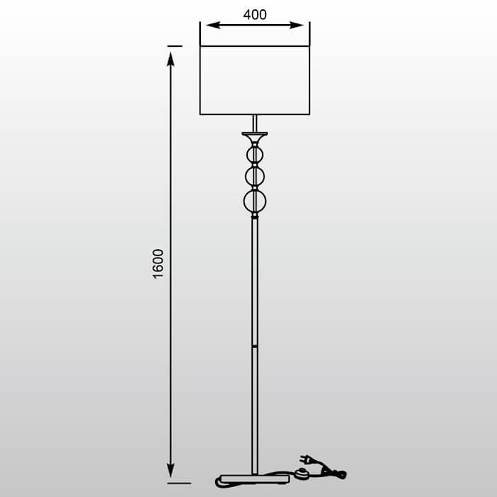 Для торшера необходима 1 лампа накаливания 60 W и цоколем E27. Лампы приобретаются отдельно. Габариты изделия: высота – 1600 мм, диаметр – 400 мм.