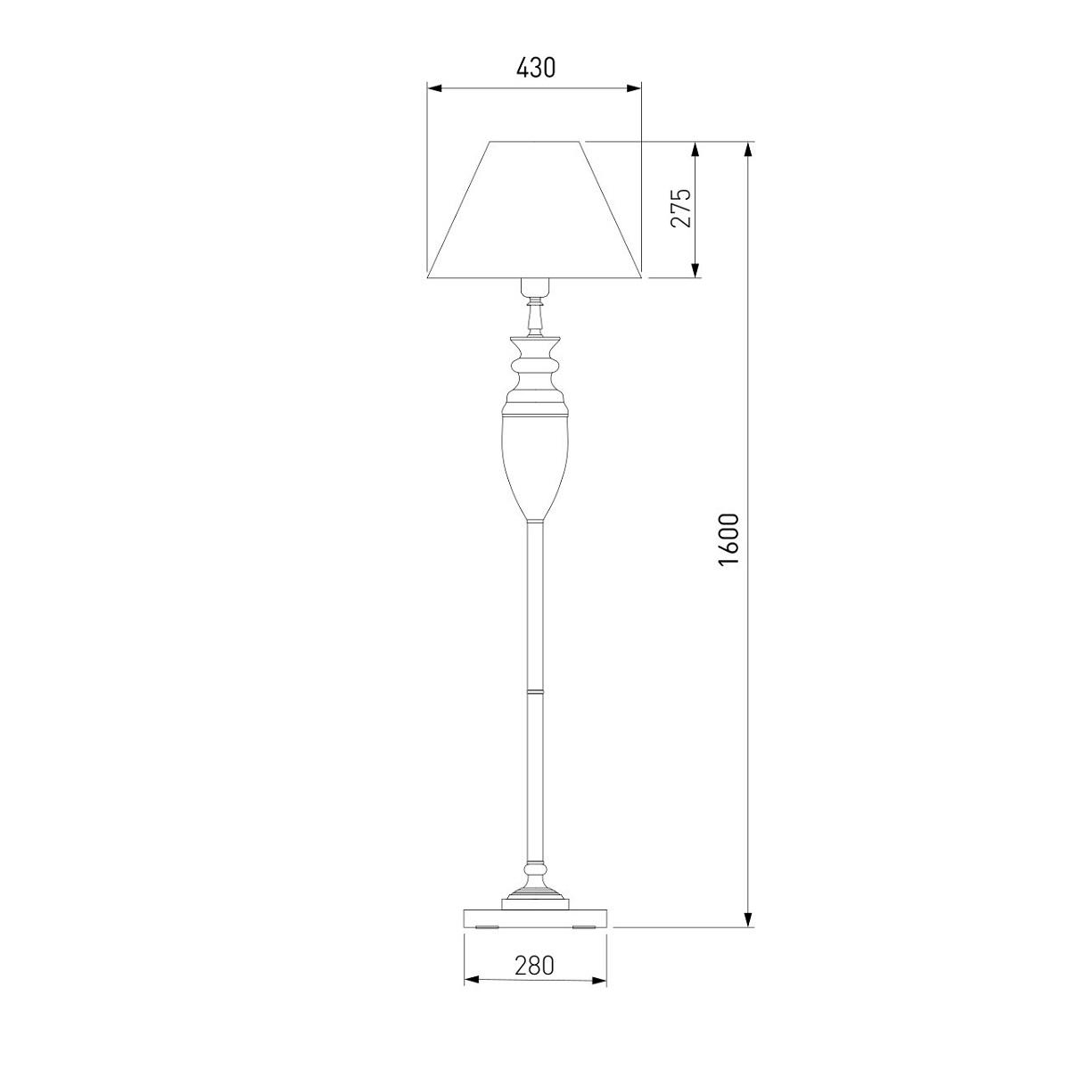 Для торшера необходима 1 лампа накаливания 40 W и цоколем E27. Лампы приобретаются отдельно. Габариты изделия: высота – 1600 мм, диаметр – 430 мм.
