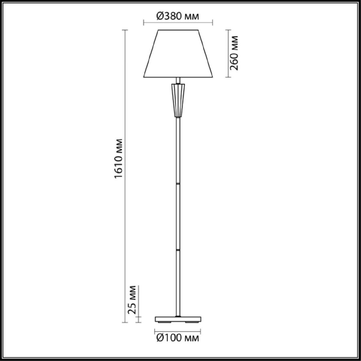 Для торшера необходима 1 лампа накаливания 60 W и цоколем E27. Лампы приобретаются отдельно. Габариты изделия: высота – 1610 мм, диаметр – 380 мм.