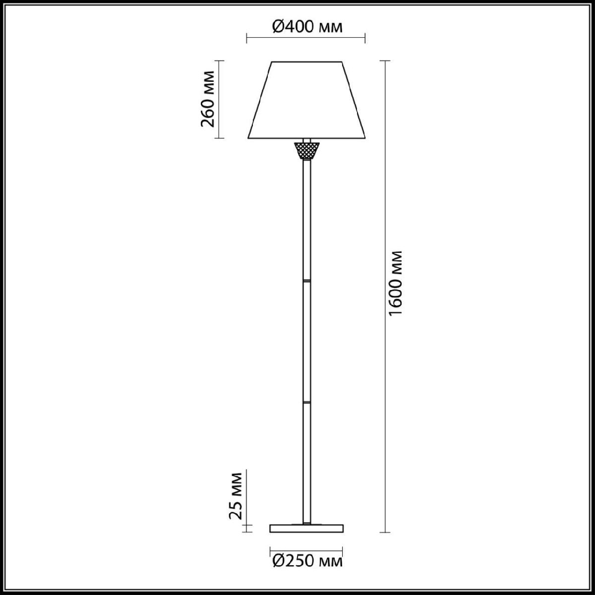 Для торшера необходима 1 лампа накаливания 60 W и цоколем E27. Лампы приобретаются отдельно. Габариты изделия: высота – 1600 мм, диаметр – 400 мм.