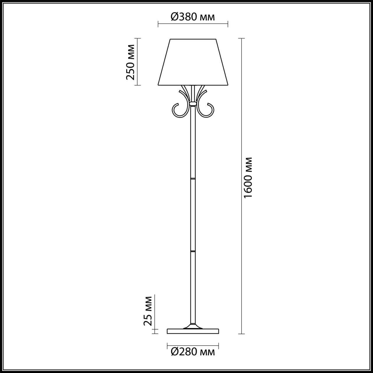 Для торшера необходима 1 лампа накаливания 60 W и цоколем E27. Лампы приобретаются отдельно. Габариты изделия: высота – 1600 мм, диаметр – 380 мм.