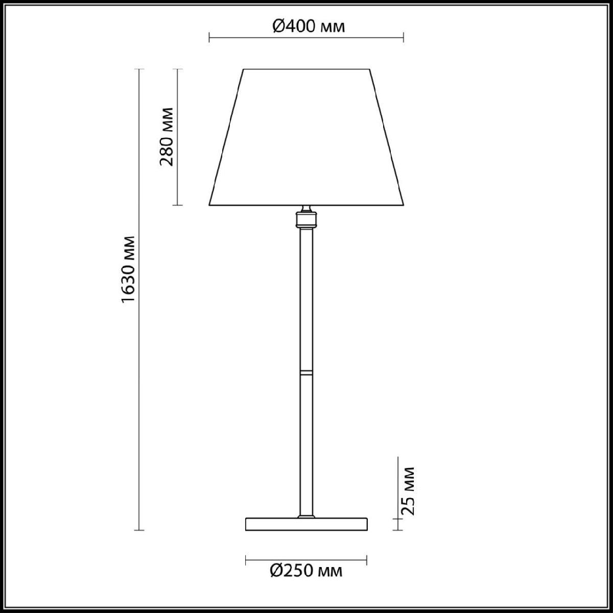 Для торшера необходима 1 лампа накаливания 40 W и цоколем E14. Лампы приобретаются отдельно. Габариты изделия: высота – 1630 мм, диаметр – 400 мм.