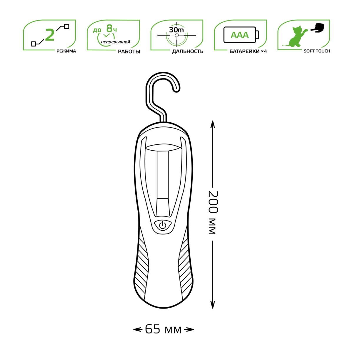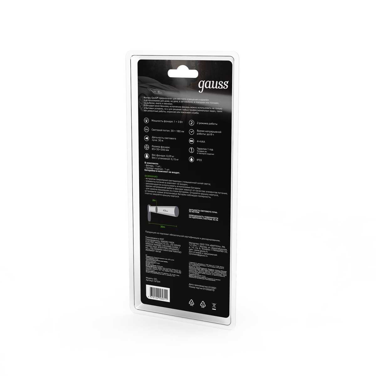 Рабочий светодиодный фонарь Gauss от батареек 200х65 210 лм GF504 от Китайского бренда из коллекции Holiday выполненный в современном стиле, осветит площадь до кв.м. Светильник имеет пластиковой корпус черного цвета с плафонами из плафонами в форме - .