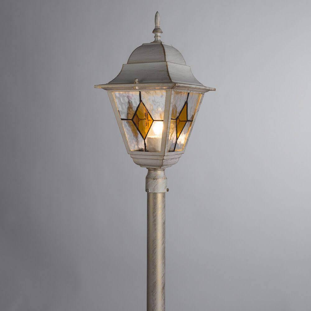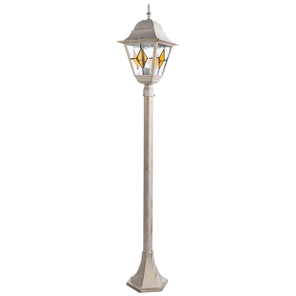 Уличный светильник Arte Lamp Berlin A1016PA-1WG от Китайского бренда из коллекции Berlin выполненный в стиле тиффани, осветит площадь до 4,2 кв.м. Светильник имеет металлической корпус белого цвета с плафонами из стекла разноцветного цвета плафонами в форме - .