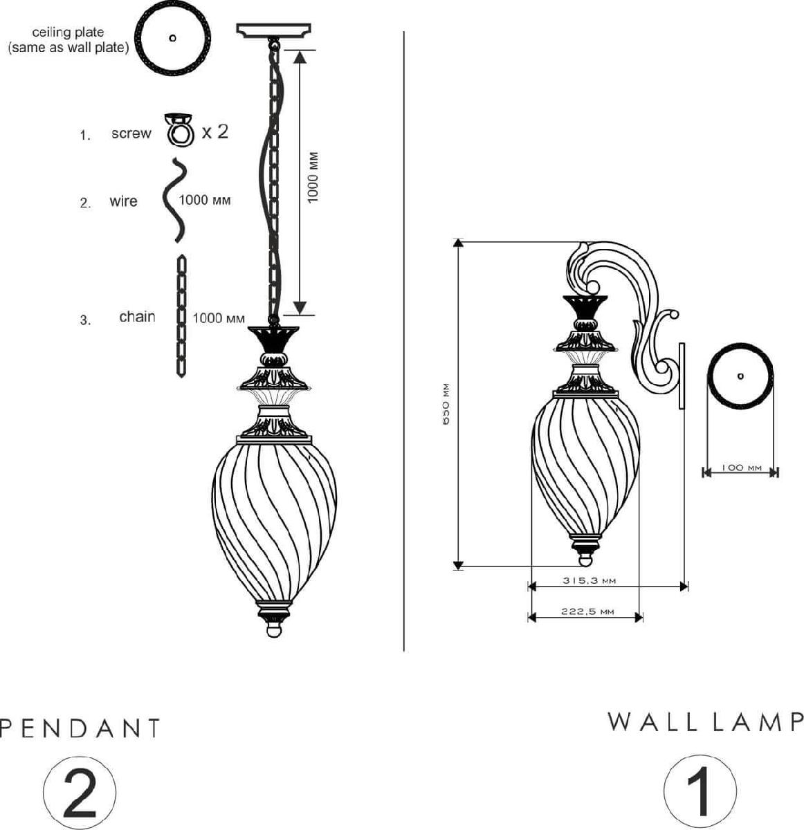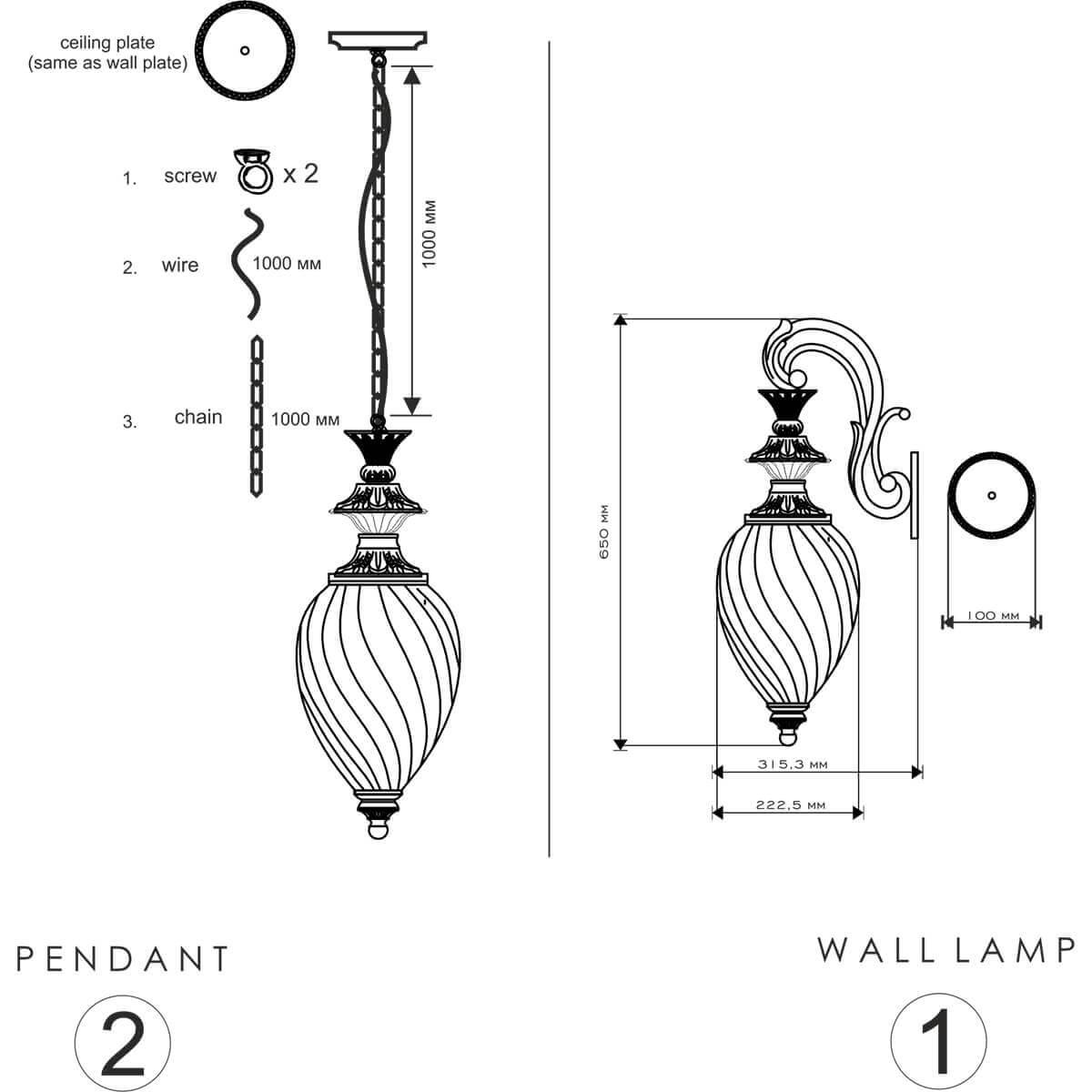 Для светильника необходима 1 лампа накаливания 60 W и цоколем E27. Лампы приобретаются отдельно. Габариты изделия: высота – 650 мм, диаметр – 220 мм.