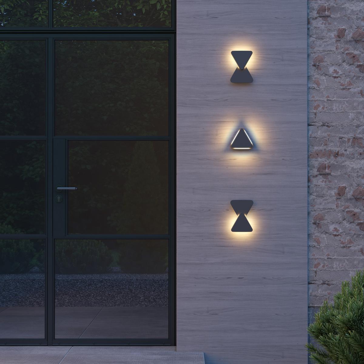 Уличный настенный светодиодный светильник Novotech Street Kaimas 358087 от Венгерского бренда Novotech из коллекции Kaimas выполненный в хай-тек стиле, осветит площадь до кв.м. Светильник имеет алюмииневой корпус темно-серого цвета с плафонами из металла темно-серого цвета плафонами в форме - треугольника.