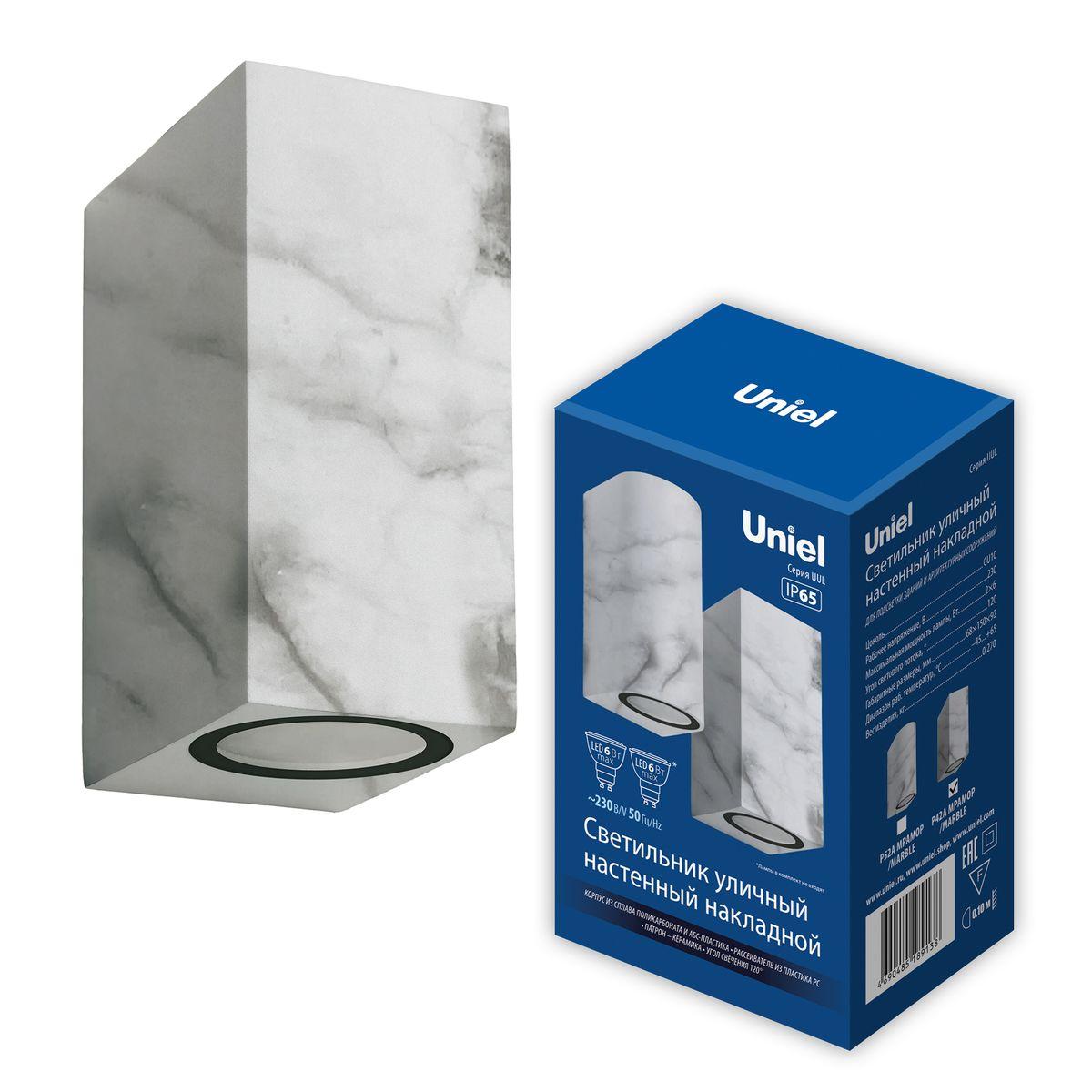 Уличный настенный светильник Uniel UUL-P42A 2х6W/GU10 IP65 Marble UL-00011362 от Китайского бренда из коллекции Marble выполненный в современном стиле, осветит площадь до кв.м. Светильник имеет корпус с плафонами из пластика плафонами в форме - .