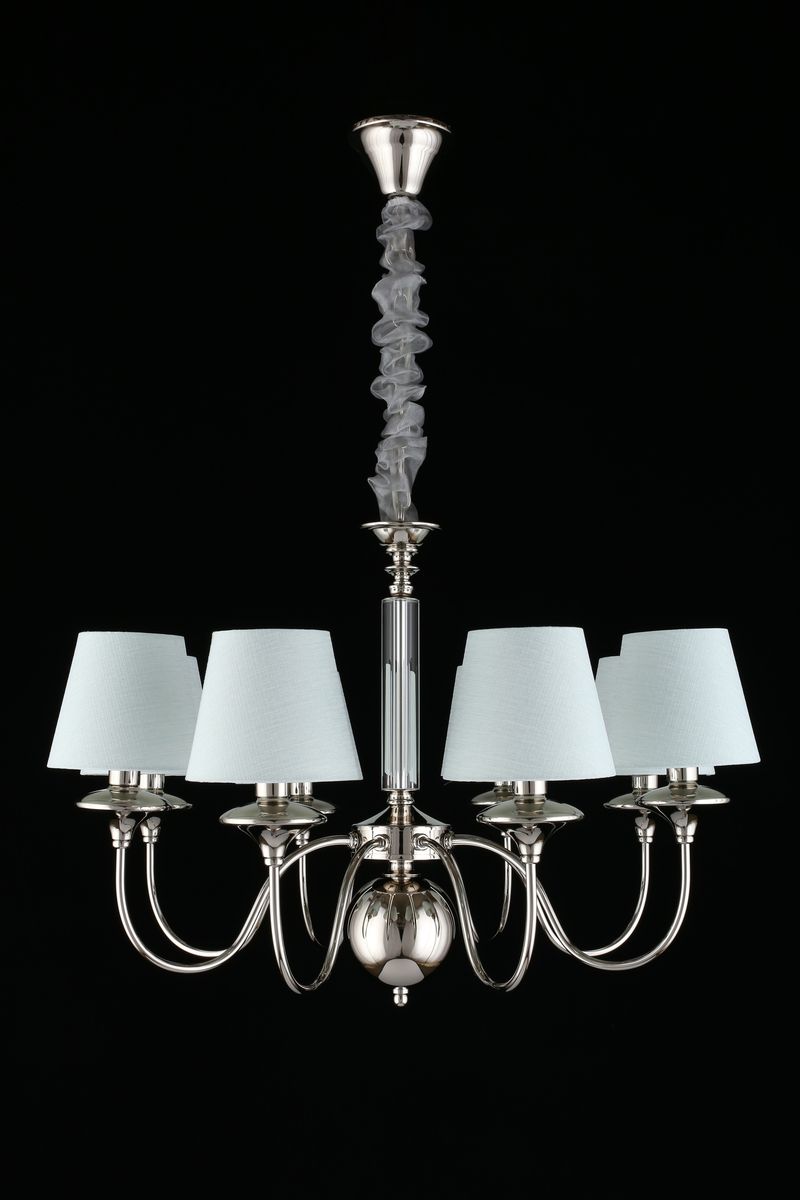Производитель светильника рекомендует для устройства 8 ламп накаливания с цоколем E14 и мощностью 40 W, что позволит осветить помещение площадью 17 кв.м. Габариты изделия: высота – 700 мм, диаметр – 750 мм.