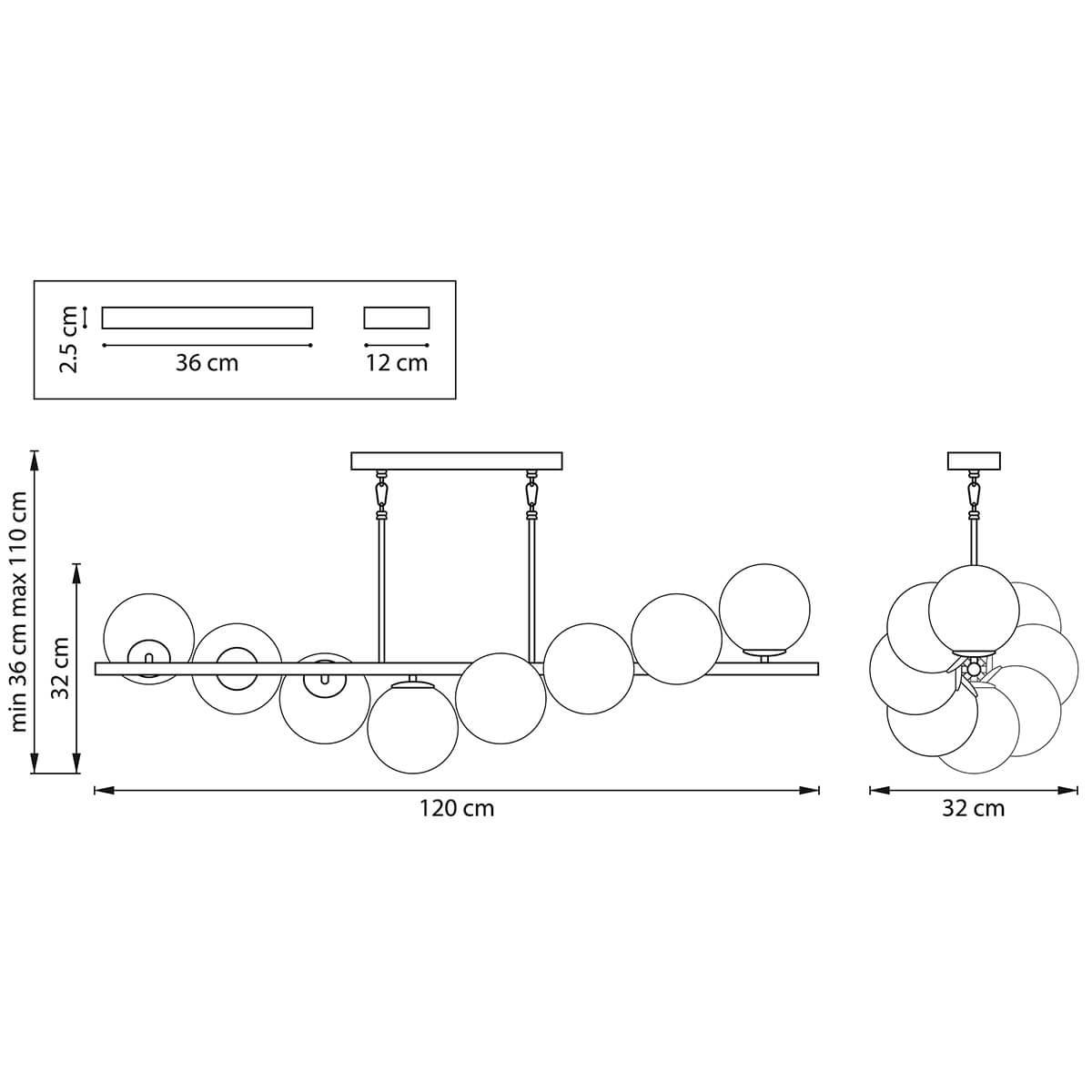 Производитель светильника рекомендует для устройства 8 ламп накаливания с цоколем E14 и мощностью 40 W, что позволит осветить помещение площадью кв.м. Габариты изделия: высота – 320 мм, диаметр – мм.