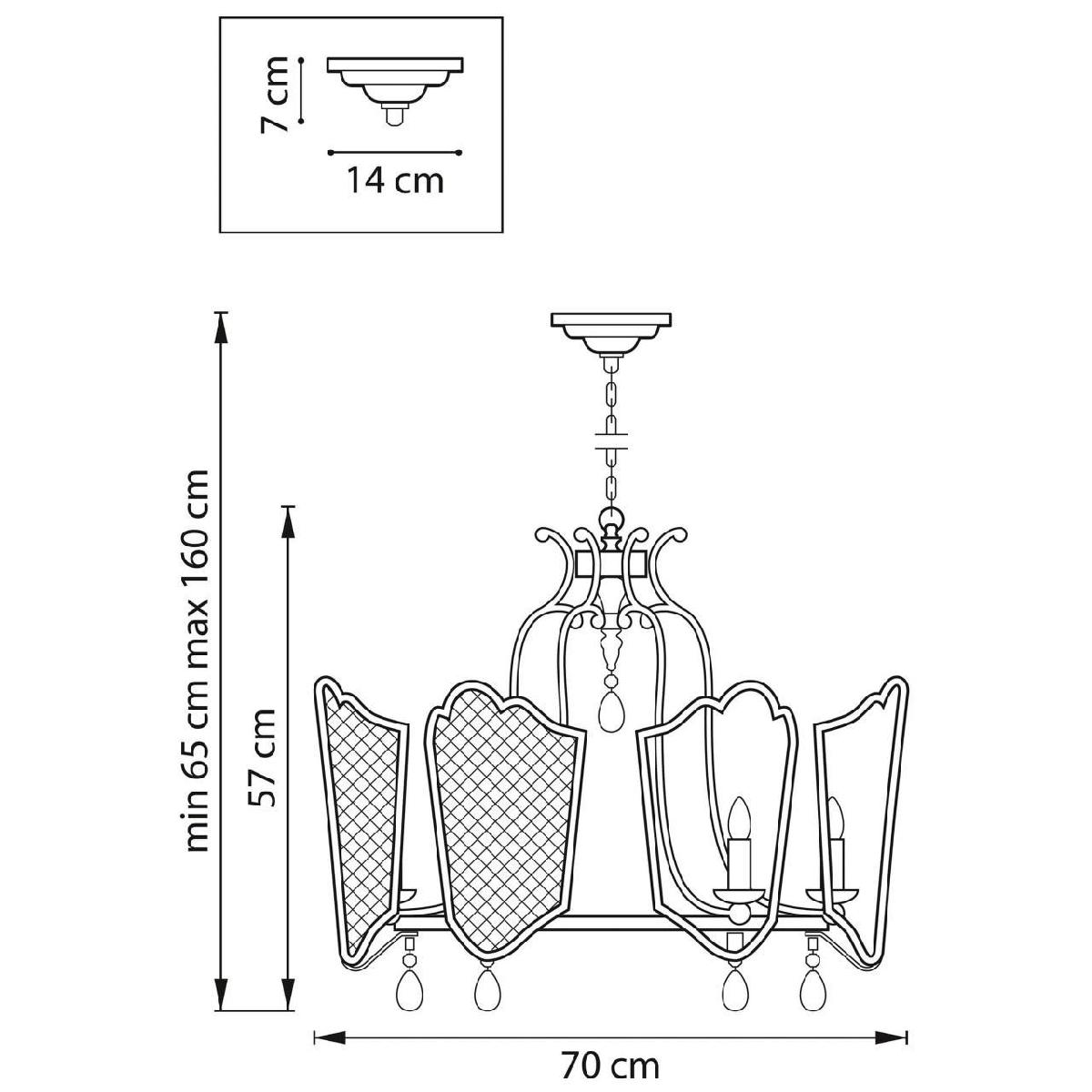 Производитель светильника рекомендует для устройства 7 ламп накаливания с цоколем E14 и мощностью 40 W, что позволит осветить помещение площадью кв.м. Габариты изделия: высота – 570 мм, диаметр – 700 мм.