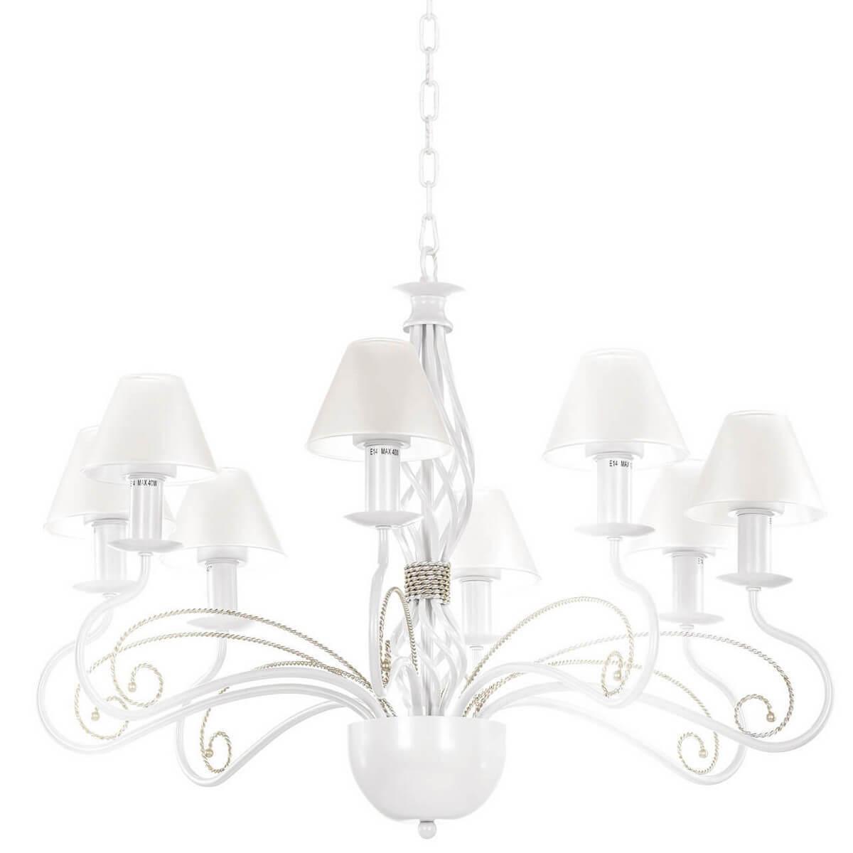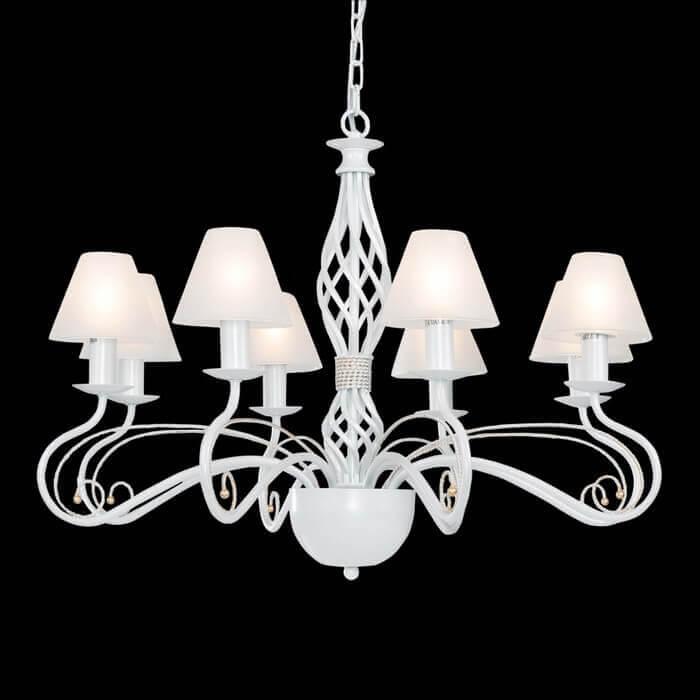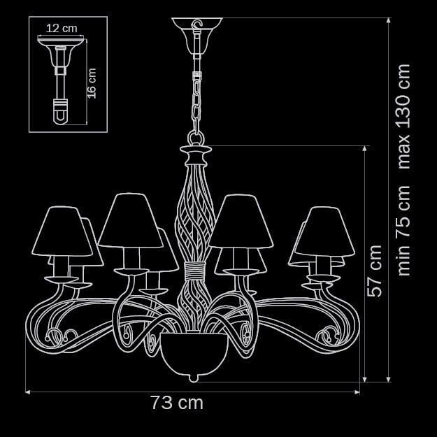 Производитель светильника рекомендует для устройства 8 ламп накаливания с цоколем E14 и мощностью 40 W, что позволит осветить помещение площадью 17,8 кв.м. Габариты изделия: высота – 570 мм, диаметр – 730 мм.
