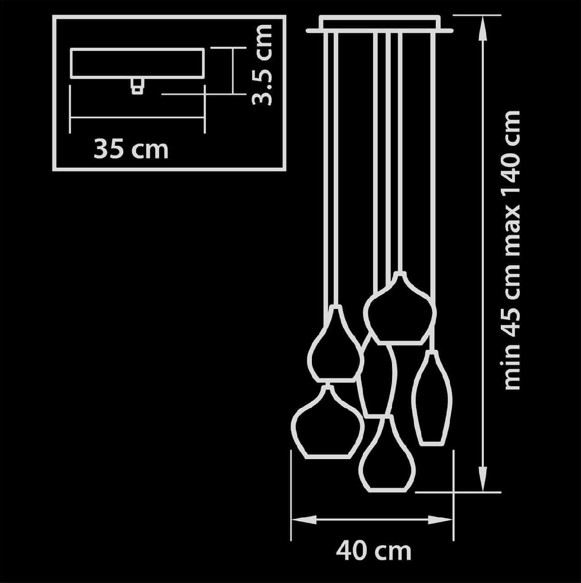Производитель светильника рекомендует для устройства 6 энергосберегающих ламп с цоколем E14 и мощностью 40 W, что позволит осветить помещение площадью 8 кв.м. Габариты изделия: высота – 1400 мм, диаметр – 400 мм.