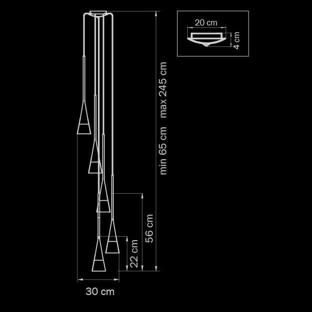 Производитель светильника рекомендует для устройства 5 ламп накаливания с цоколем E14 и мощностью 40 W, что позволит осветить помещение площадью 11,1 кв.м. Габариты изделия: высота – 560 мм, диаметр – 300 мм.