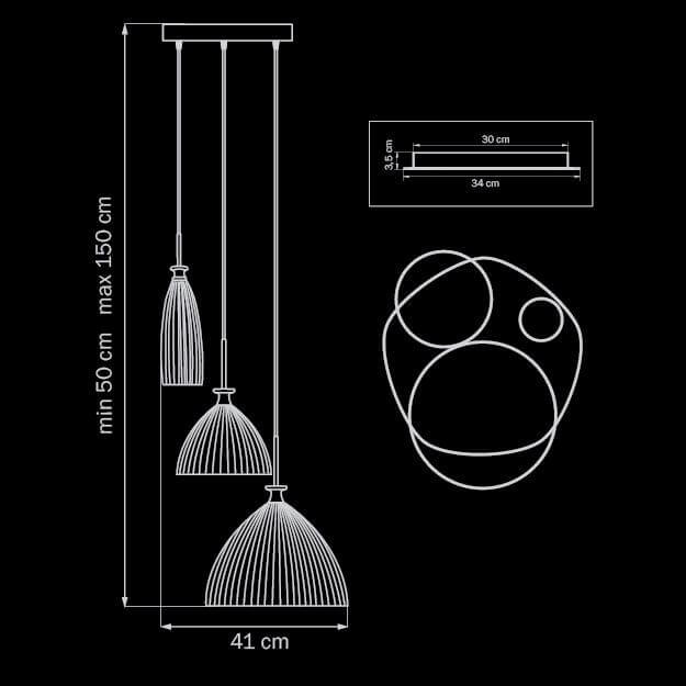 Производитель светильника рекомендует для устройства 3 лампы накаливания с цоколем E14 и мощностью 40 W, что позволит осветить помещение площадью 6,7 кв.м. Габариты изделия: высота – 1500 мм, диаметр – 410 мм.