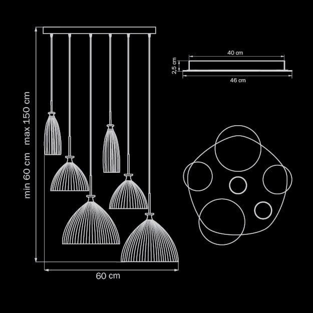 Производитель светильника рекомендует для устройства 6 ламп накаливания с цоколем E14 и мощностью 40 W, что позволит осветить помещение площадью 13 кв.м. Габариты изделия: высота – 1500 мм, диаметр – 600 мм.