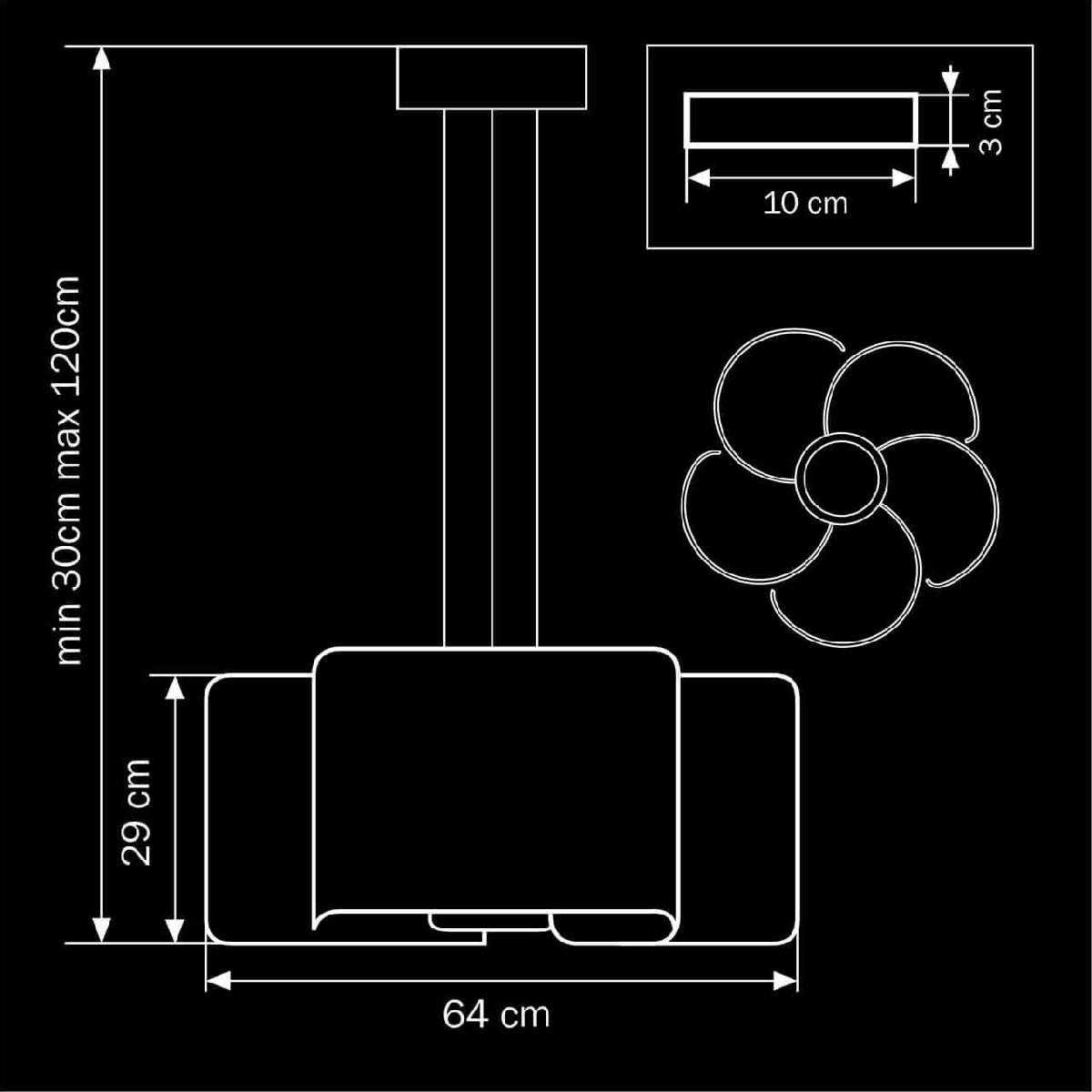 Производитель светильника рекомендует для устройства 5 ламп накаливания с цоколем E27 и мощностью 40 W, что позволит осветить помещение площадью 11,1 кв.м. Габариты изделия: высота – 200 мм, диаметр – 640 мм.