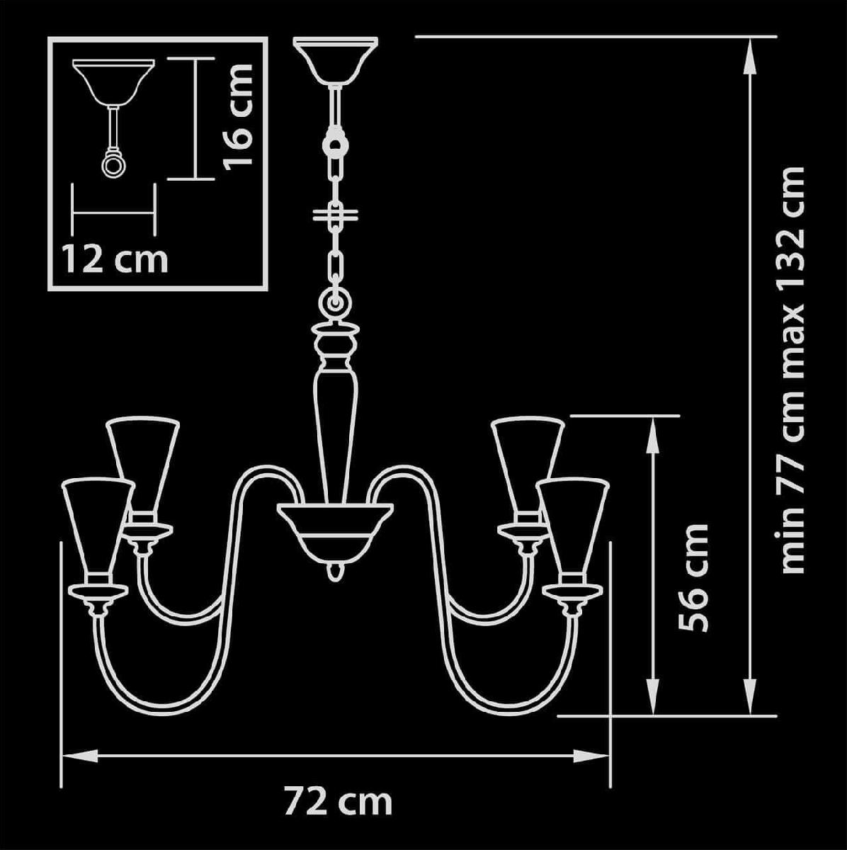 Производитель светильника рекомендует для устройства 10 галогеновых ламп с цоколем E14 и мощностью 40 W, что позволит осветить помещение площадью 22,2 кв.м. Габариты изделия: высота – 1320 мм, диаметр – 720 мм.