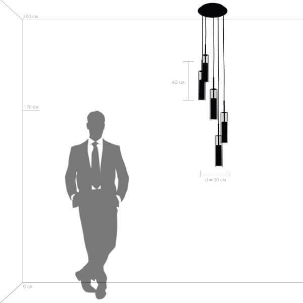 Производитель светильника рекомендует для устройства 5 галогеновых ламп с цоколем GU10 и мощностью 40 W, что позволит осветить помещение площадью 11 кв.м. Габариты изделия: высота – 420 мм, диаметр – 300 мм.