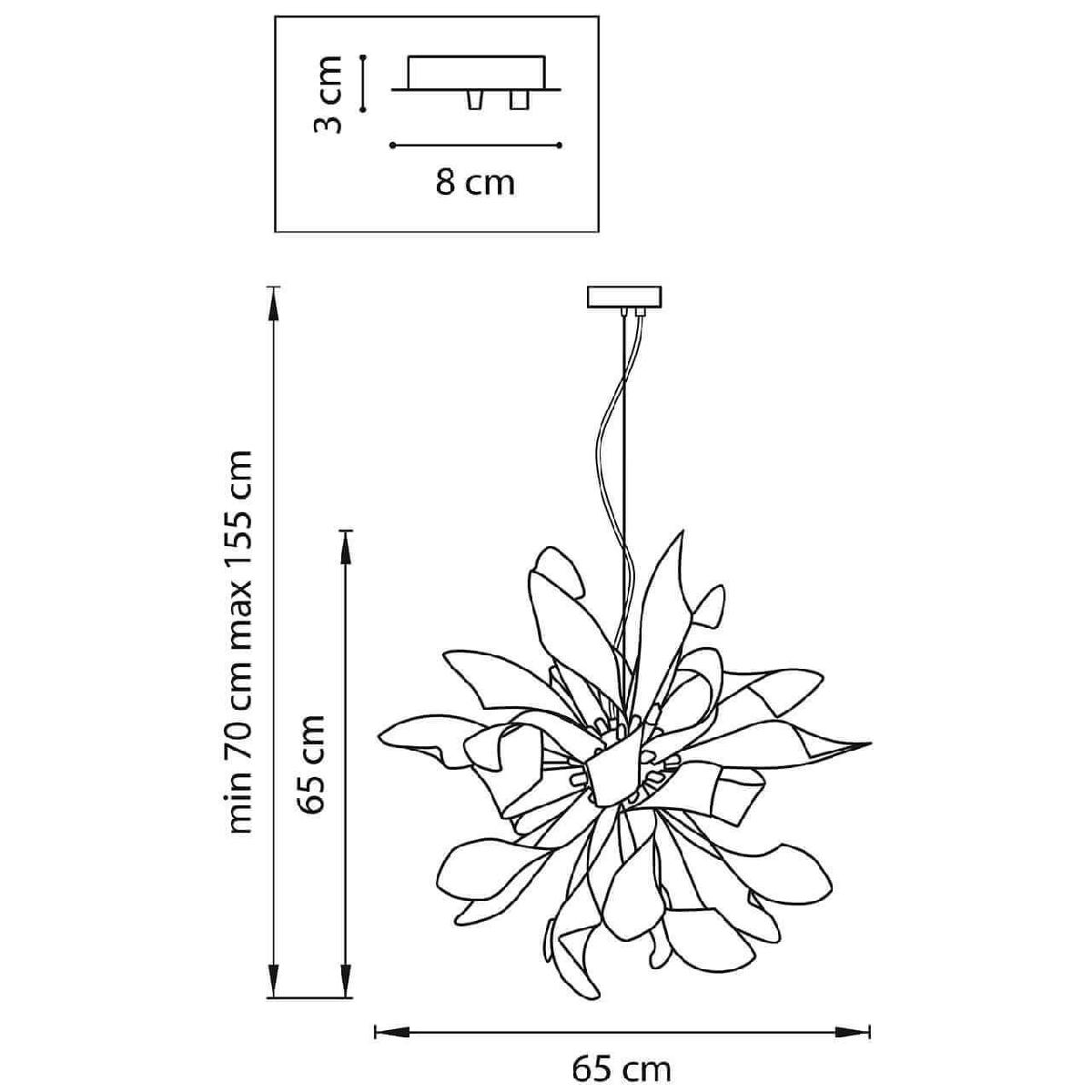 Производитель светильника рекомендует для устройства 6 галогеновых ламп с цоколем G9 и мощностью 6 W, что позволит осветить помещение площадью 13 кв.м. Габариты изделия: высота – 650 мм, диаметр – 650 мм.