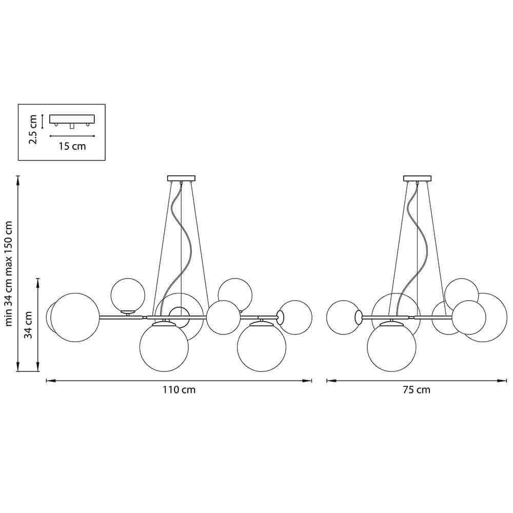 Производитель светильника рекомендует для устройства 9 галогеновых ламп с цоколем G9 и мощностью 40 W, что позволит осветить помещение площадью кв.м. Габариты изделия: высота – 340 мм, диаметр – мм.