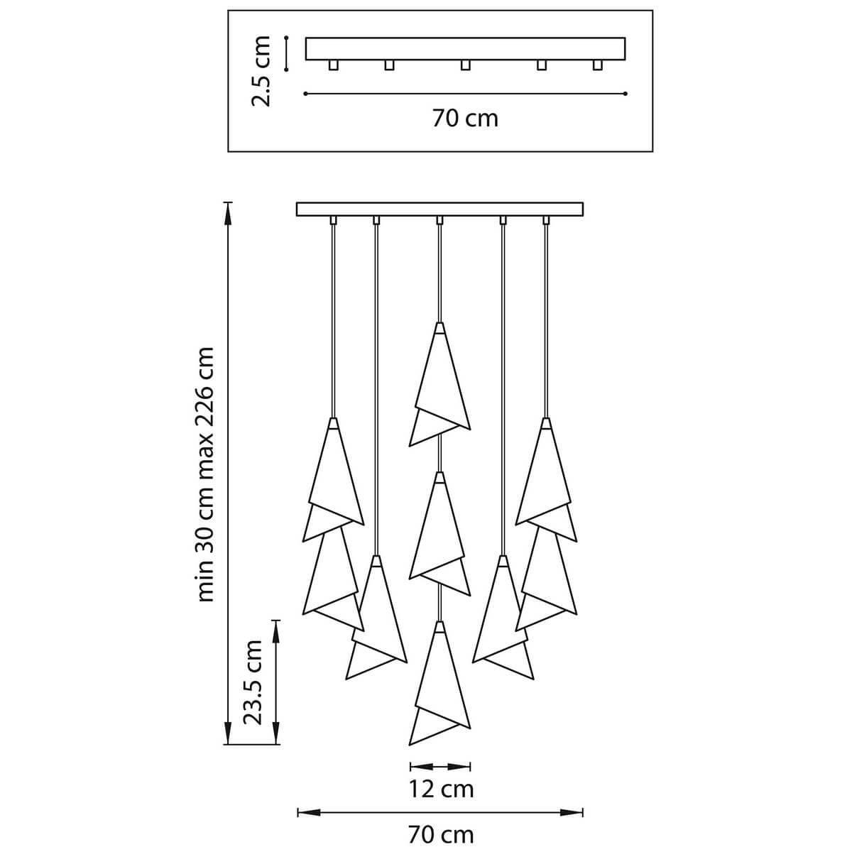 Производитель светильника рекомендует для устройства 9 ламп накаливания с цоколем E14 и мощностью 40 W, что позволит осветить помещение площадью 20 кв.м. Габариты изделия: высота – 235 мм, диаметр – 700 мм.