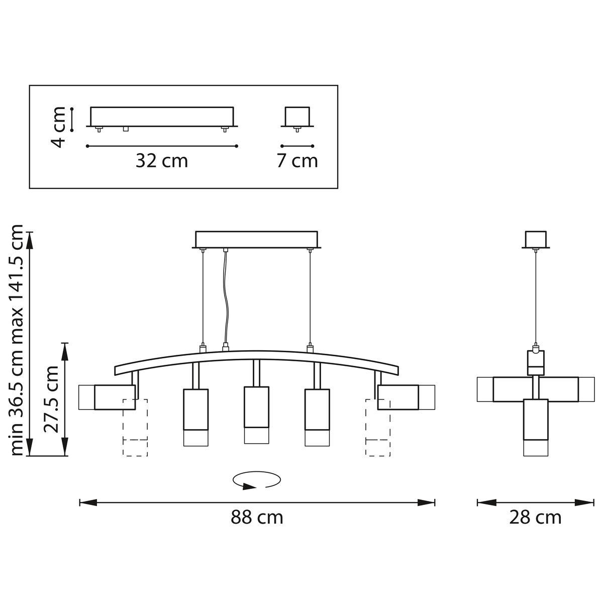 Производитель светильника рекомендует для устройства 5 галогеновых ламп с цоколем GU10 и мощностью 50 W, что позволит осветить помещение площадью кв.м. Габариты изделия: высота – 365 мм, диаметр – мм.