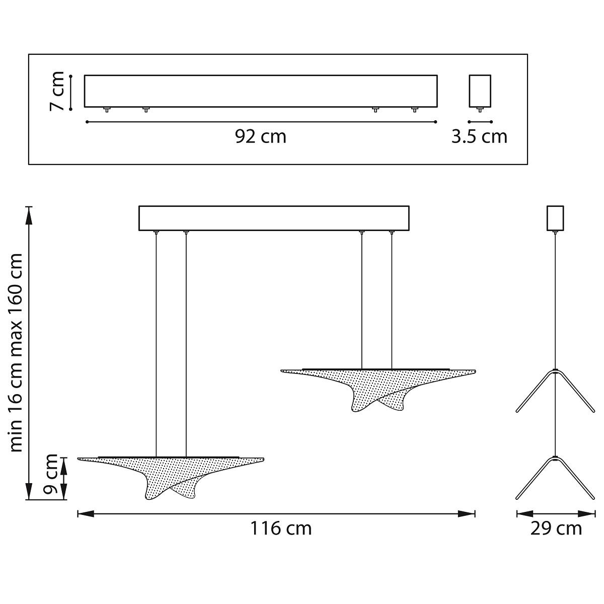 Производитель светильника рекомендует для устройства 2 светодиодные лампы с цоколем LED и мощностью 35 W, что позволит осветить помещение площадью кв.м. Габариты изделия: высота – 160 мм, диаметр – мм.
