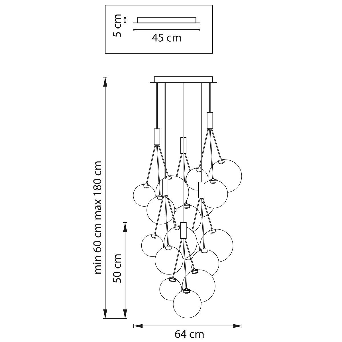 Производитель светильника рекомендует для устройства 18 светодиодных ламп с цоколем LED и мощностью 1 W, что позволит осветить помещение площадью кв.м. Габариты изделия: высота – 600 мм, диаметр – 640 мм.