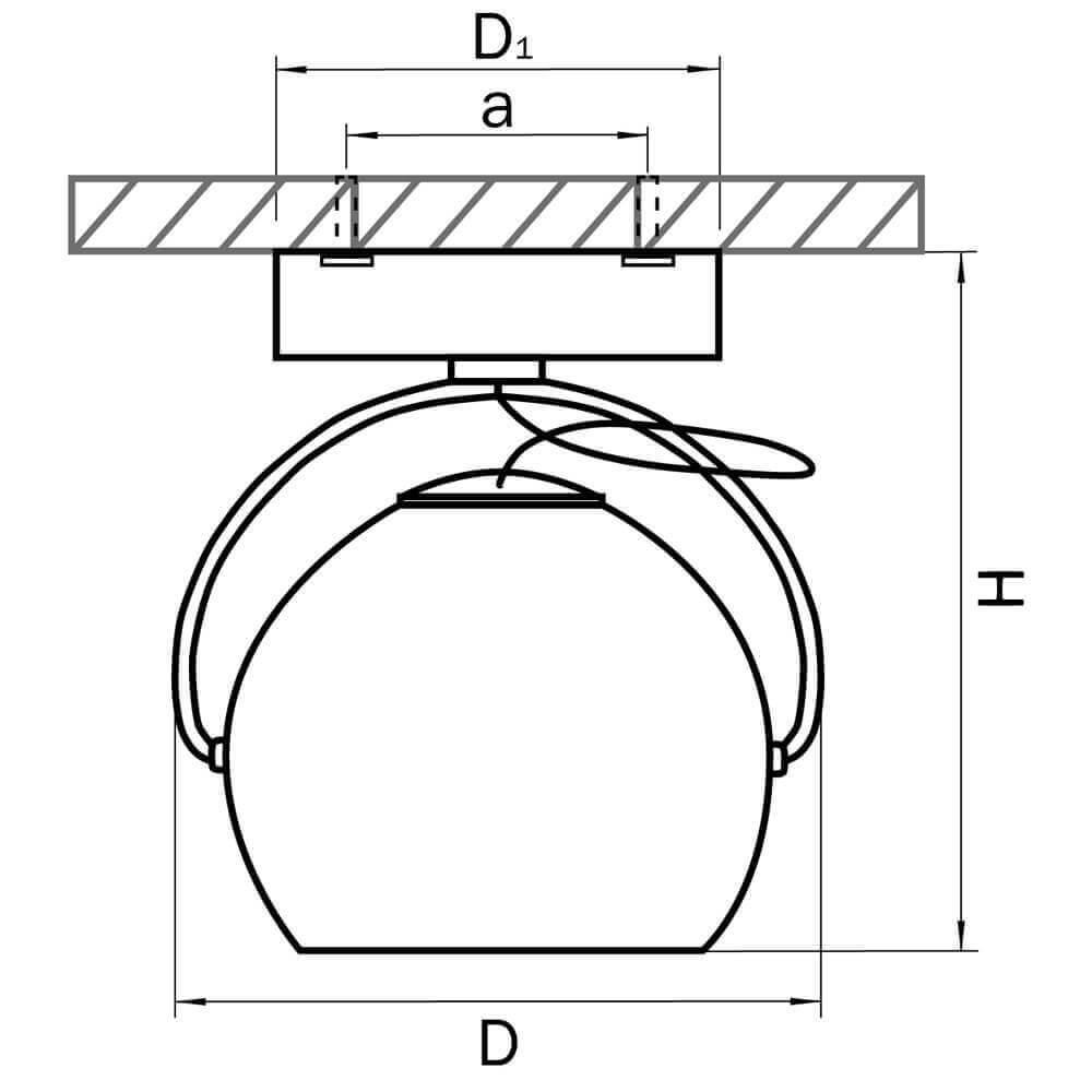 Для спота необходима 1 галогеновая лампа 50 W и цоколем GU10. Габариты изделия: высота – 110 мм, диаметр – 90 мм.