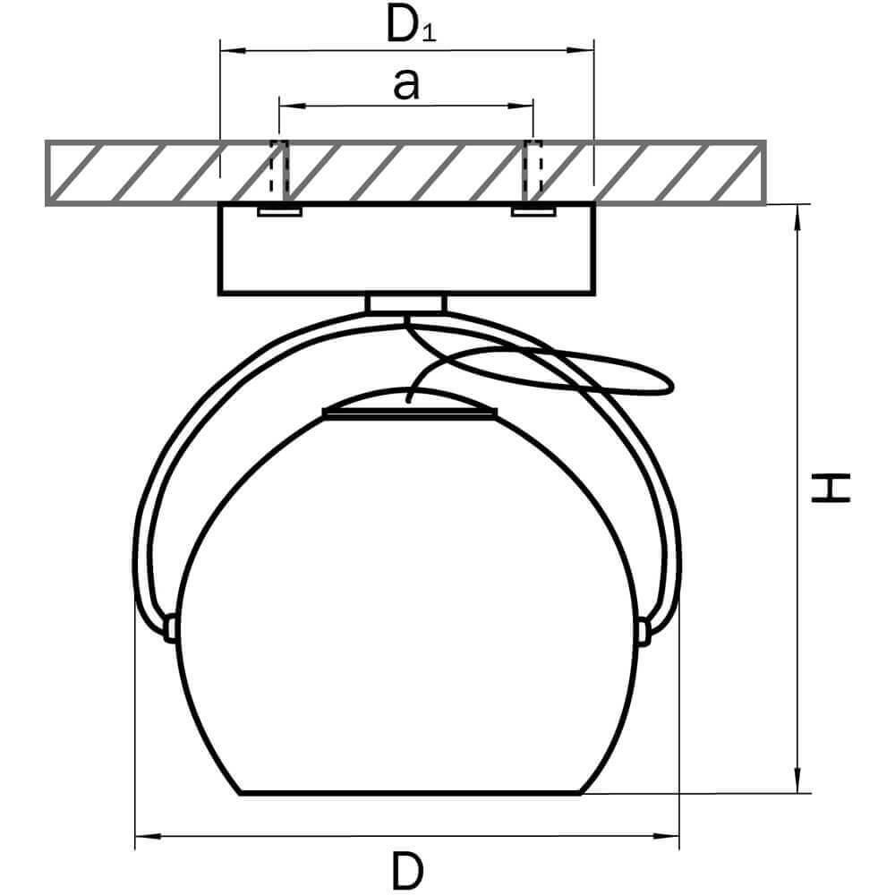 Для спота необходима 1 галогеновая лампа 50 W и цоколем GU10. Габариты изделия: высота – 110 мм, диаметр – 90 мм.