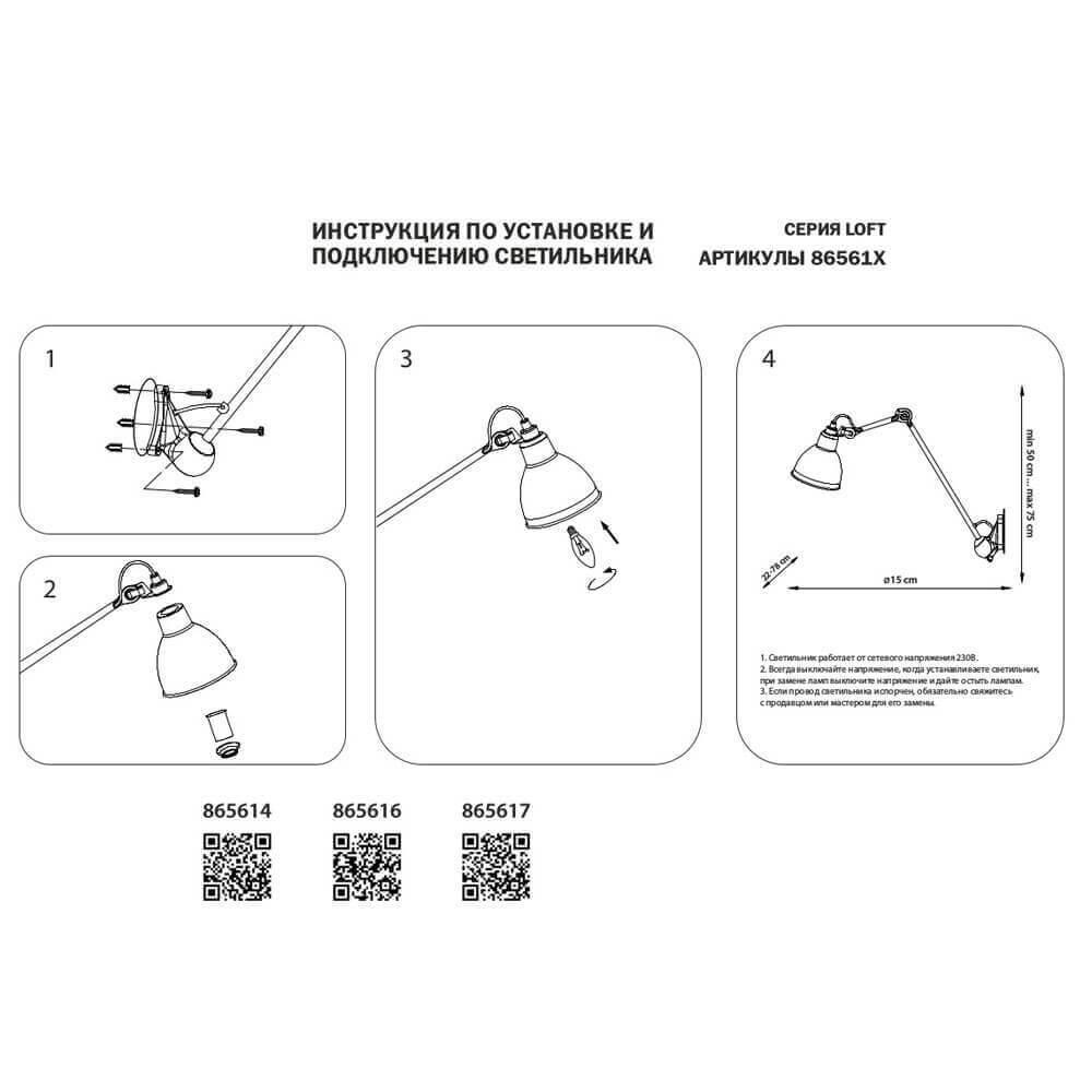 Для спота необходима 1 лампа накаливания 40 W и цоколем E14. Габариты изделия: высота – 745 мм, диаметр – мм.