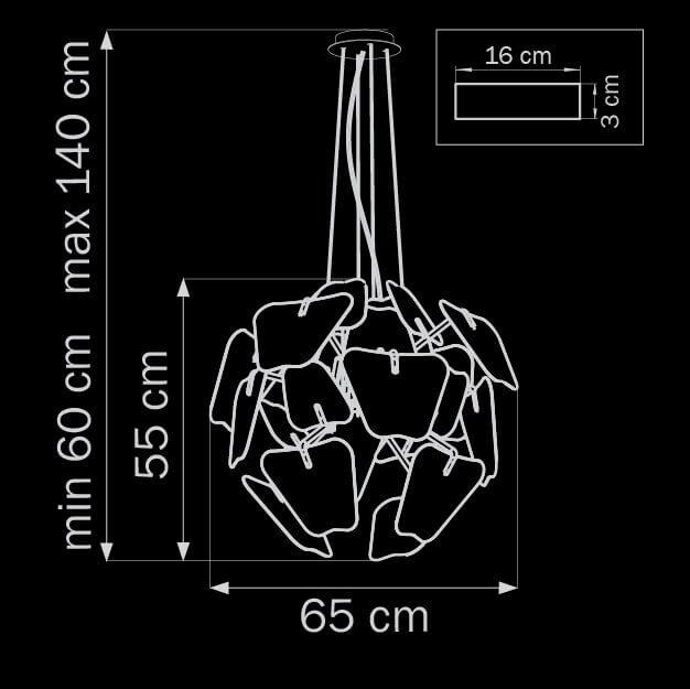 Для светильника необходима 1 лампа накаливания 40 W. Габариты изделия: высота – 550 мм, диаметр – 650 мм.